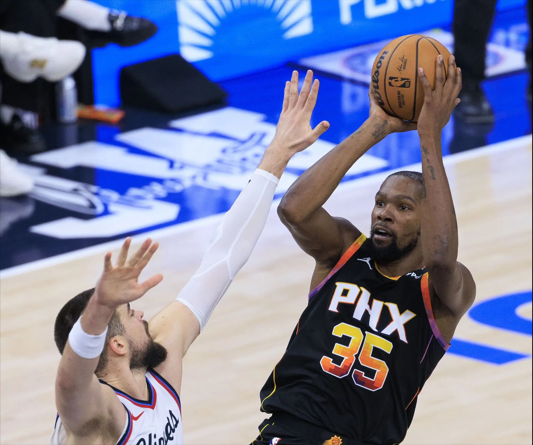 卡佩拉为中锋他和哈登配合默契。杜兰特在四号位可以拉空间又能攻坚,本身攻防一体。本赛季太阳虽然没有进附加赛,但杜兰特能出战的时候,太阳胜率53%。杜兰特无法出战时,太阳靠布克仅仅取得2胜17负的战绩。这已经可以说明杜兰特虽老还有不少油。我们知道快船这三巨头很老了,是夕阳红战队。可这个三巨头就算没夺冠话题性不也拉满了。鲍尔默可以再赌一把,反正19年换乔治都亏到姥姥家了。可都走到现在,你放弃没什么意义。
